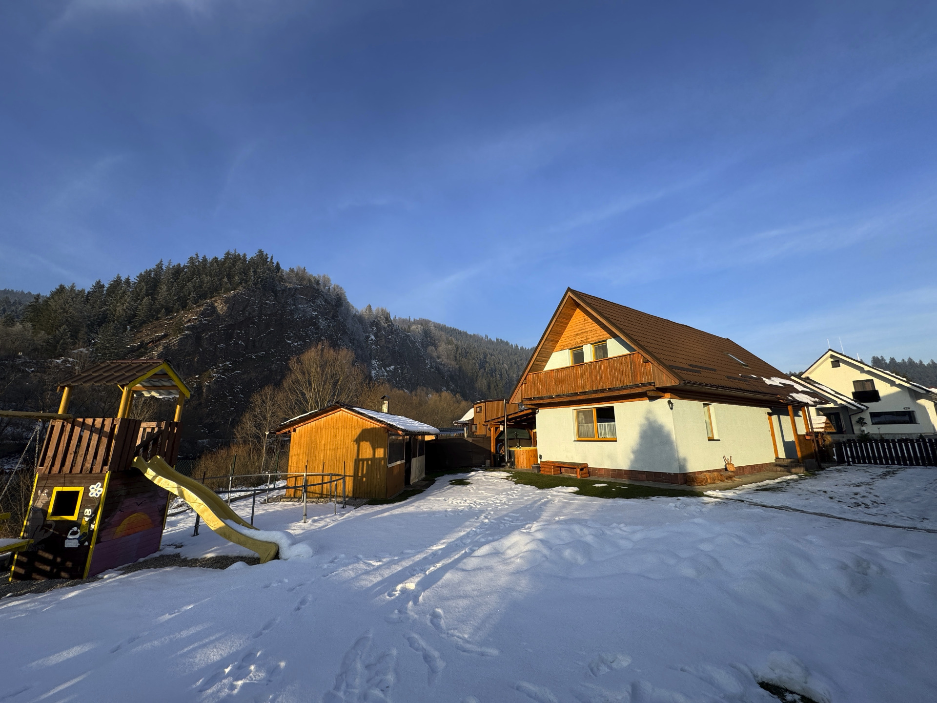 Chata ubytuje 10 osôb ( plus 2 prístelky) v 4 spálňach (3 kúpeľne, 4x WC). Ubytovanie je k dispozícii len pre Vás. Pobyt s malým psom je povolený za poplatok. K dispozícii sú sauna, kúpacia kaďa. Vonku sa nachádza ohnisko, altánok, vonkajšie posedenie, vonkajší krb, kotlík, záhradná hojdačka a gril. Ubytovanie je vhodné pre rodiny s deťmi, k dispozícii je detské ihrisko, detský kútik, hračky, detská stolička, detská postieľka, trampolína, šmýkačka, pieskovisko a detská hojdačka. Pozemok je oplotený. Parkovanie je možné pri objekte.